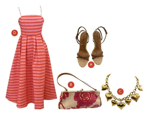 There’s something about a girls’ night out at the shore making it effortless, a little dressed up, and full of energy as the sun dips and the evening begins. We stopped by The Preppy Palm in Avalon to pull together a look that feels equal parts playful and polished, perfect for everything from sunset cocktails to late-night laughs. The star of the outfit is an English Factory striped midi dress that instantly sets the tone. With its flattering fitted bodice, delicate straps, and full, flowing skirt, it strikes that ideal balance between feminine and fun. The bold pink and coral stripes bring a fresh pop of color that feels right at home against a coastal backdrop, making it a standout piece for the season. Paired with the dress are the Steve Madden “Jypsey” heels, an easy choice for warm-weather evenings. With their woven texture, soft neutral tones, and ankle strap for added support, they offer just the right amount of lift without sacrificing comfort. They’re the kind of heel you can actually wear all night, whether you’re heading to dinner or dancing your way through the evening. Accessories tie the look together, starting with the Glenda Gies “Jackie” bag. Its structured silhouette and vintage-inspired clasp give it a timeless feel, while the textured fabric and vibrant floral pattern add a playful, eye-catching twist. It’s compact yet statement-making and the perfect companion for a night out. To finish, a bold gold heart necklace adds just the right amount of shine. With its chunky chain and sculptural heart charms, it brings a touch of personality and polish, elevating the entire look with a hint of glamour. Chic, vibrant, and effortlessly put together, this is girls’ night out style that feels as fun as the plans themselves.